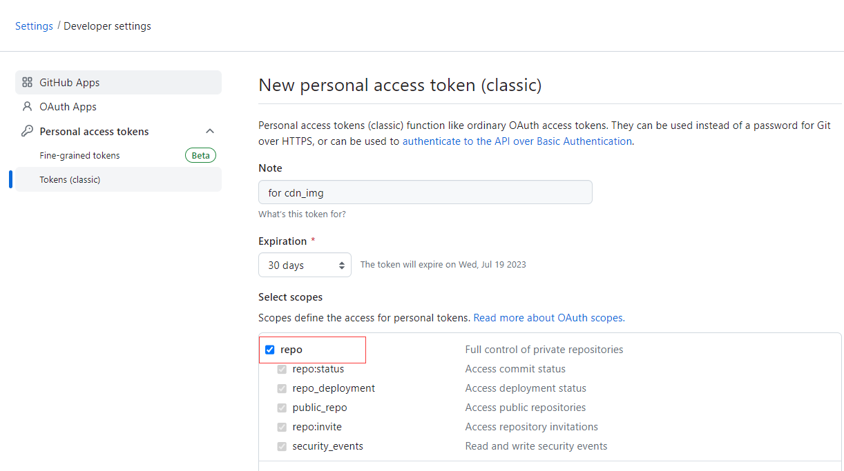 在Github创建repo,访问 https://github.com/settings/tokens 创建token,勾选所有选项框给予picgo权限。(时限可以给无限期)